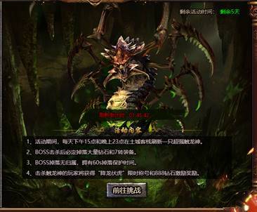 活动说明:每天下午15点和晚上23点在土城客栈刷新超强触龙神,击杀后将会掉落大量钻石以及7转装备。