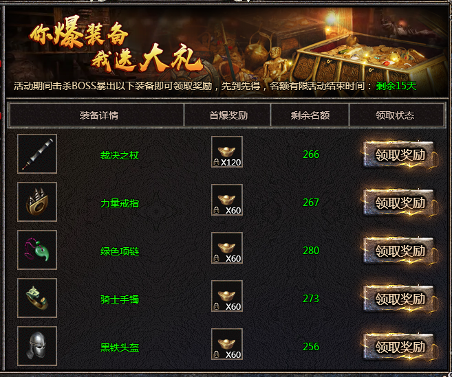 活动内容:活动期间玩家通过击杀BOSS首次爆出装备将获得对应的奖励