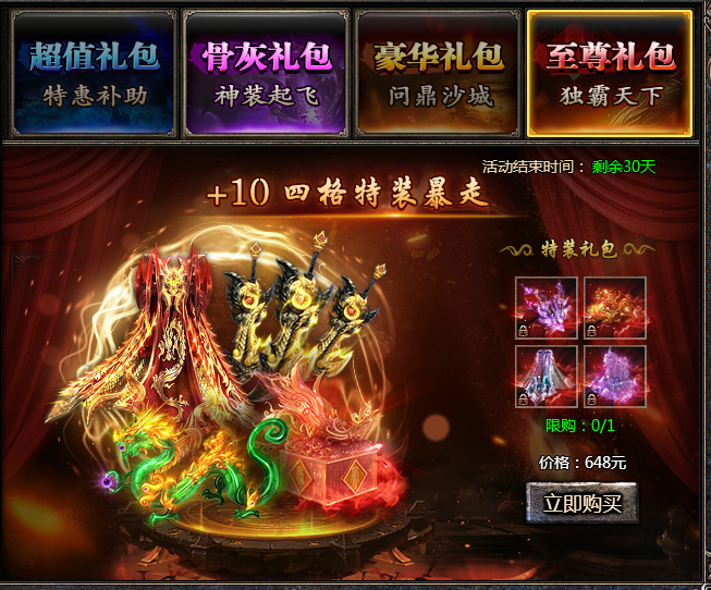 活动内容:开服期间将会提供四种超值礼包供玩家选择。玩家可根据自身不同需求选择相应的礼包,让自己赢在起跑线上!