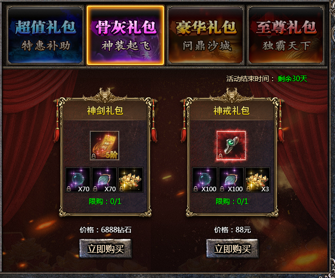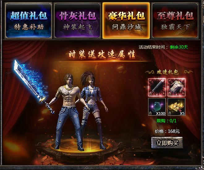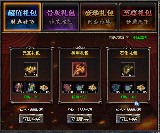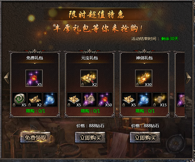 活动内容:每天都可购买多种道具大礼包,资源不再愁