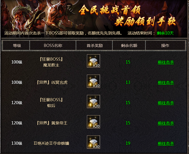 活动内容:活动期间当玩家在游戏中首次击杀BOSS后将可以领取钻石奖励,名额有限先到先得