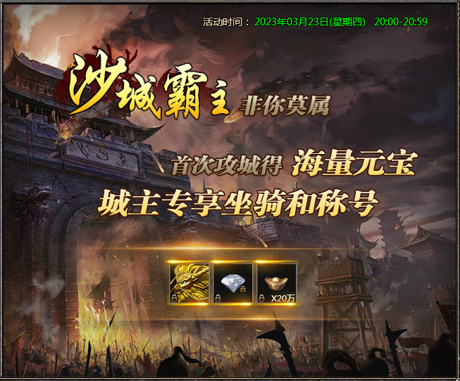 活动内容:首次攻城获得海量元宝和钻石,城主专享坐骑和称号