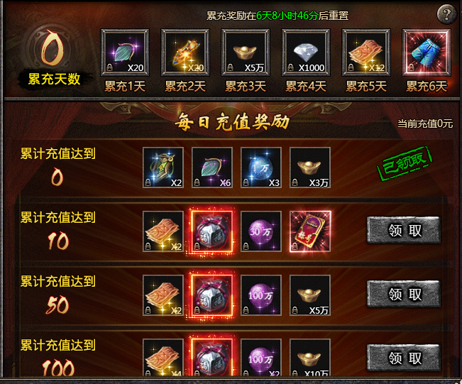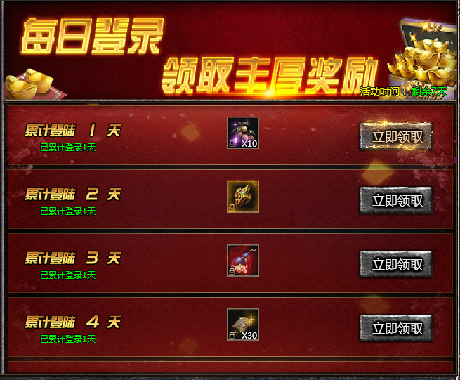 活动内容:开服期间玩家每日登录可以领取丰厚奖励,累计登录天数越多奖励越丰厚