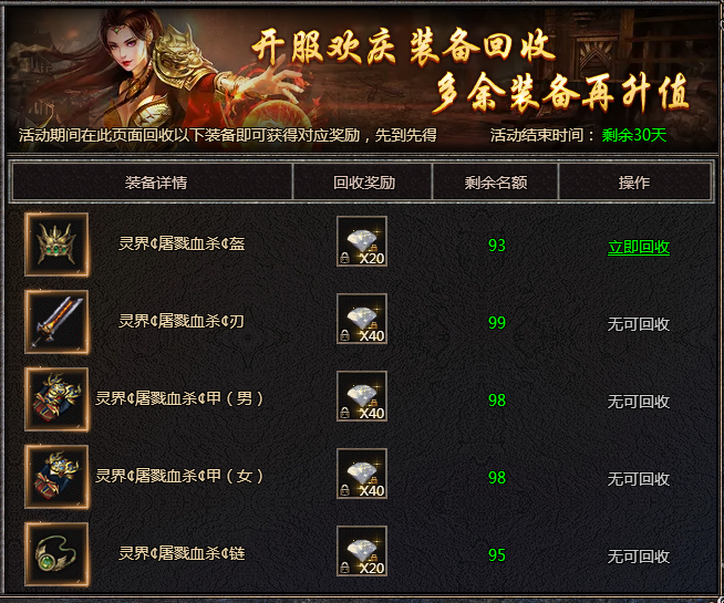 活动内容:活动期间玩家可以回收对应的装备获得回收奖励,将多余的装备变废为宝
